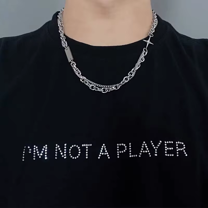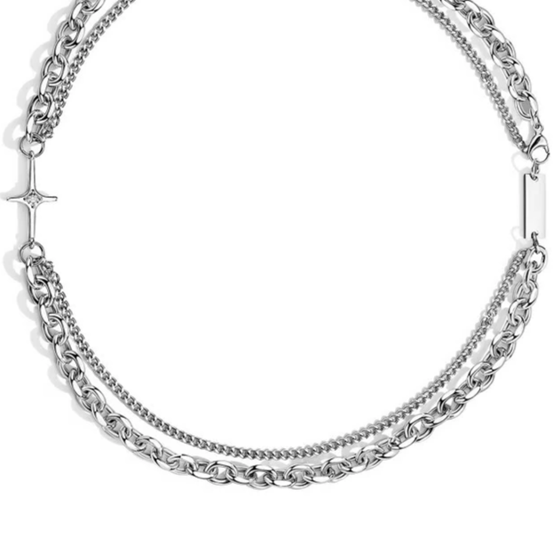 Made from stainless steel, the chains and accents resist rust and wear. The polished silver finish keeps each detail crisp, catching the light on both the sharp star and smooth bar.