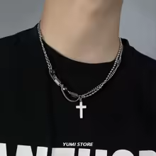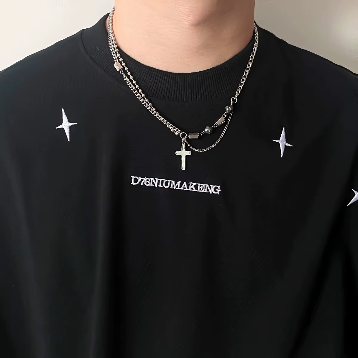 Constructed from stainless steel, the chains and pendant resist rust, tarnish, and daily wear. The polished silver finish keeps every line sharp and reflective, holding its sleek look through any season.