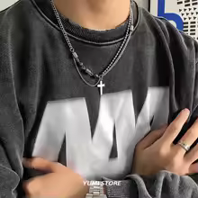 Two chains, offset and partially overlaid, flow together into a clean, minimal cross pendant. The layered arrangement adds quiet depth without stealing attention from the simplicity of the pendant. It’s stripped-back, balanced, and made for those who want presence without noise.